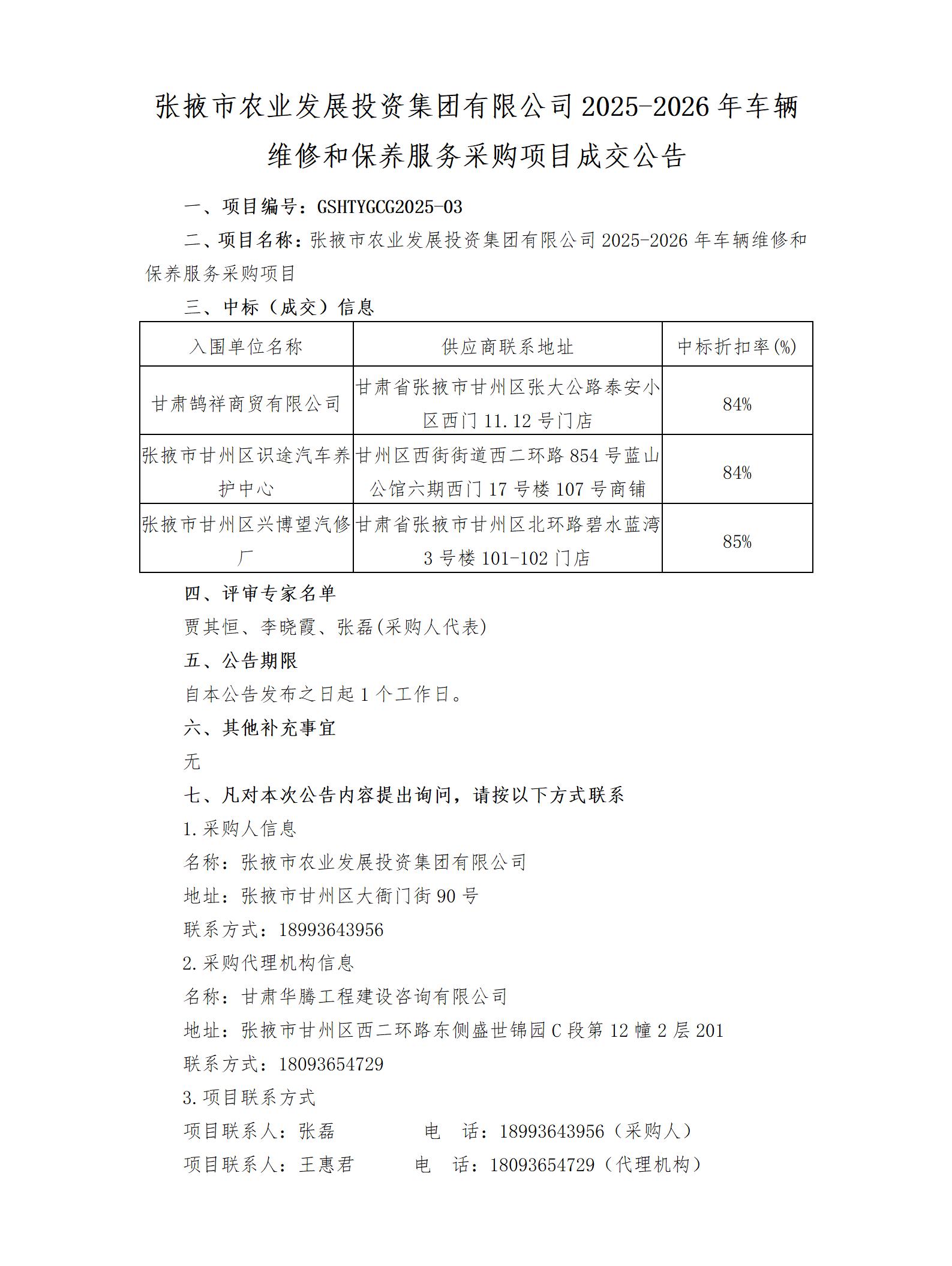 张掖市农业发展投资集团有限公司2025-2026年车辆维修和保养服务采购项目成交公告