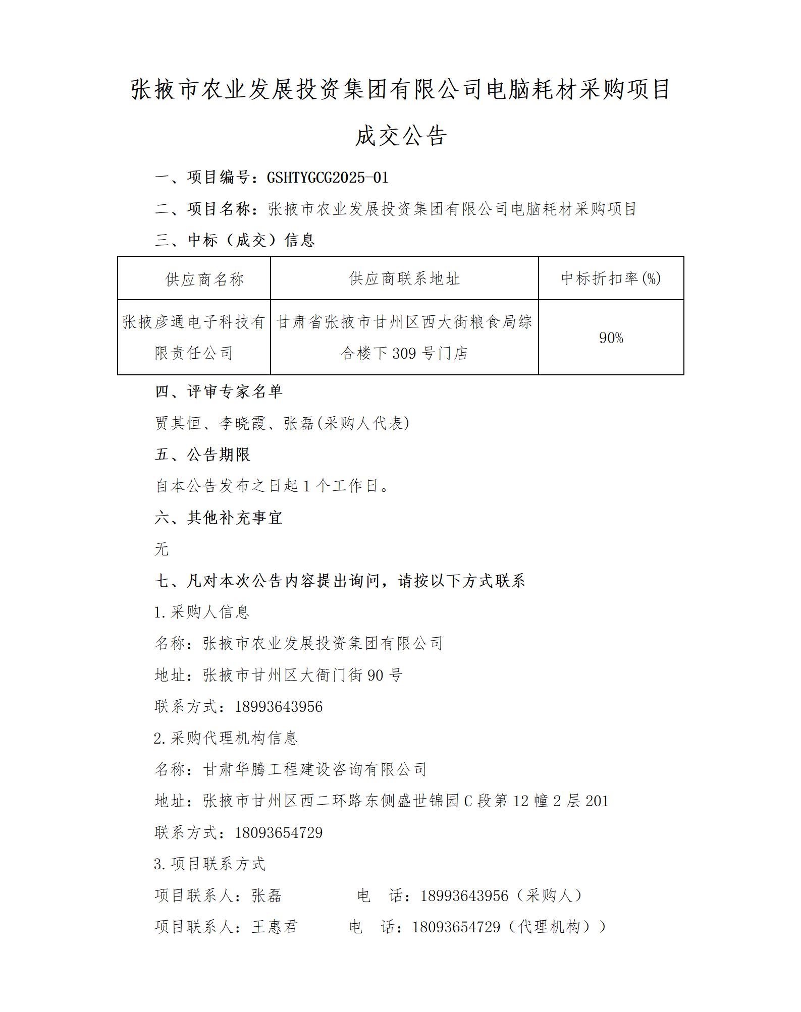 张掖市农业发展投资集团有限公司电脑耗材采购项目成交公告