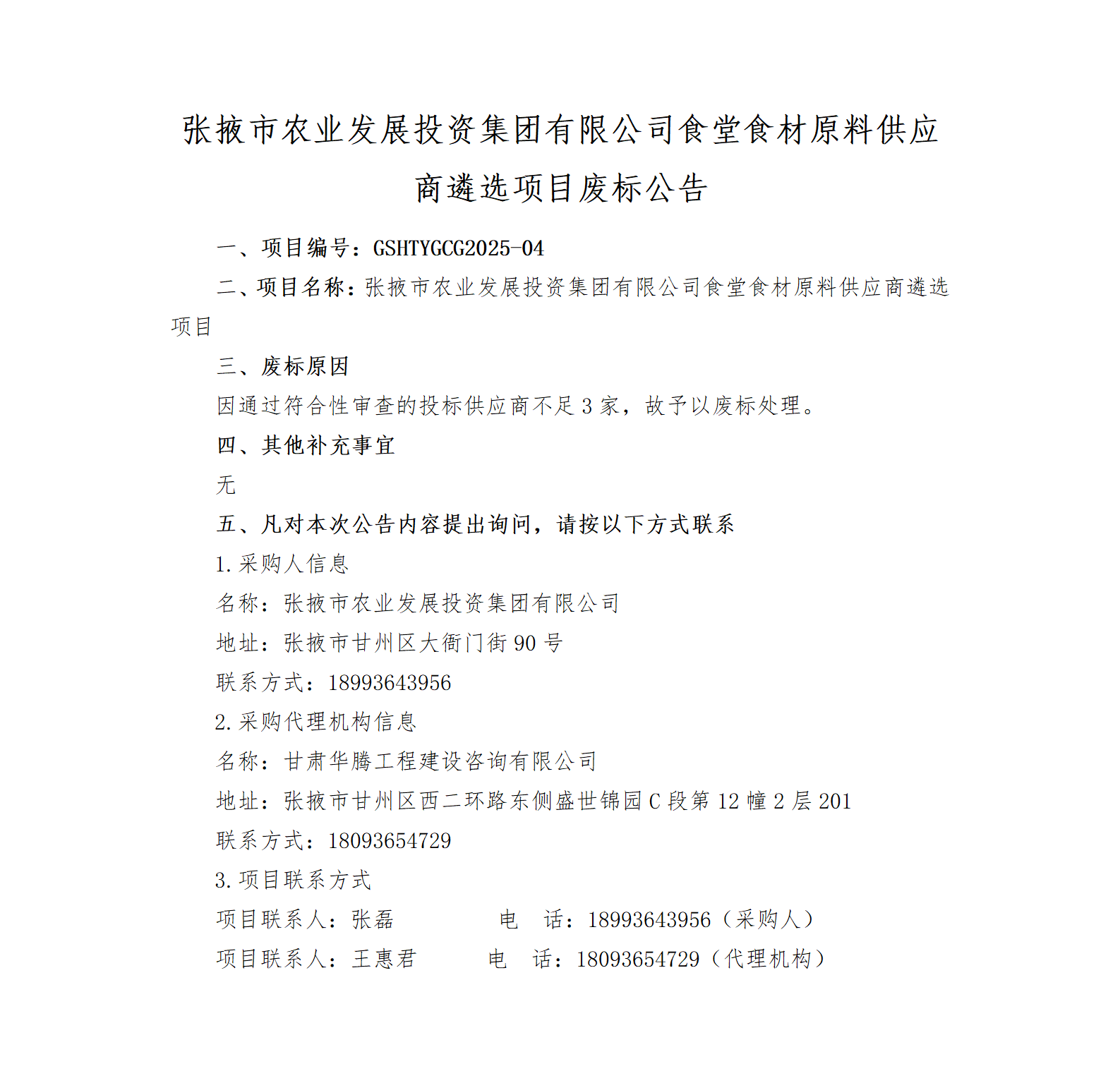 张掖市农业发展投资集团有限公司食堂食材原料供应商遴选项目废标公告